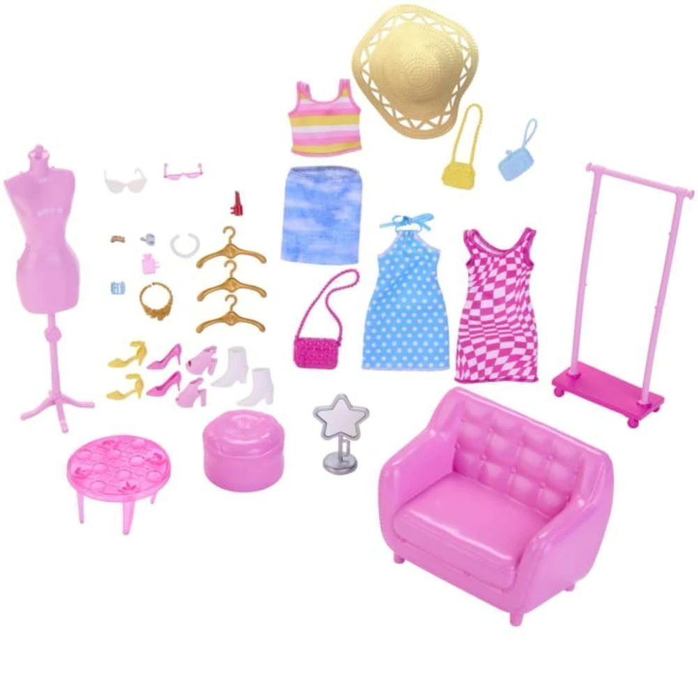 Conteúdo da embalagem: 1 Barbie® com 3 modelitos completos, 1 sofá, 1 mesa, 1 pufe, 1 arara, 1 manequim, 1 espelho, 3 cabides e acessórios de estilo variados. A boneca não fica em pé sozinha. As cores e as decorações podem variar.
