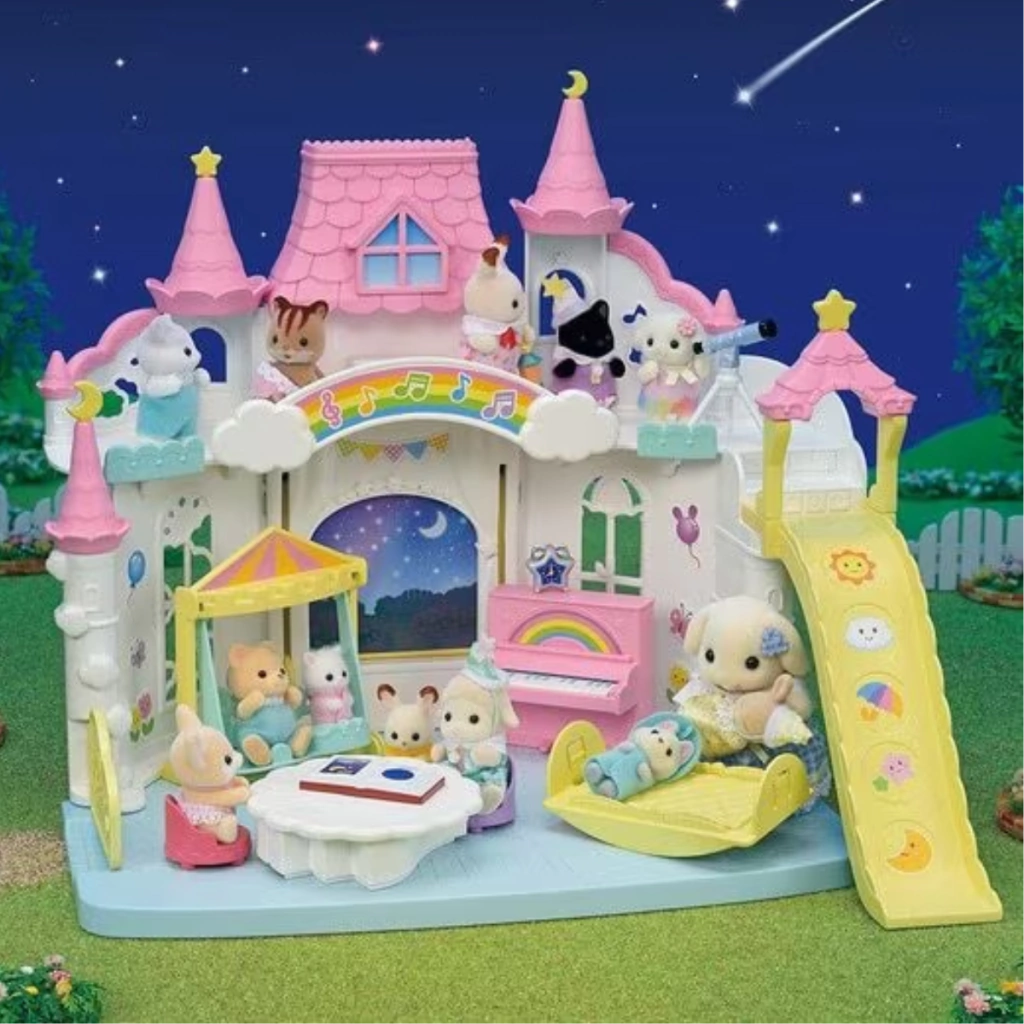 O Castelo Ensolarado Jardim de Infância vem com um jardim de infância com mudança de tempo e o Bebê Coelho Floral.