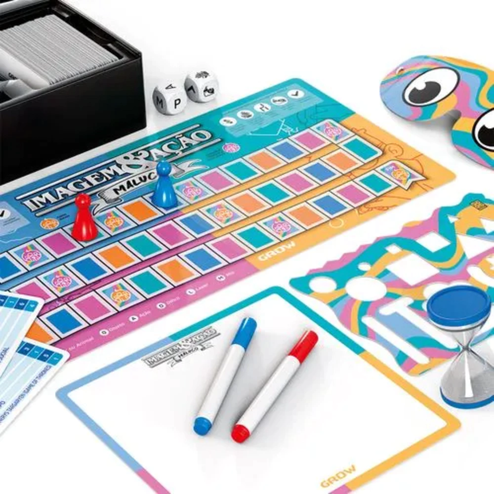 Prepare-se para a diversão! No Imagem & Ação Maluco, cada jogador terá sua vez de brilhar como desenhista ou mestre das mímicas, só que antes... deverá encarar um desafio sorteado no dado!