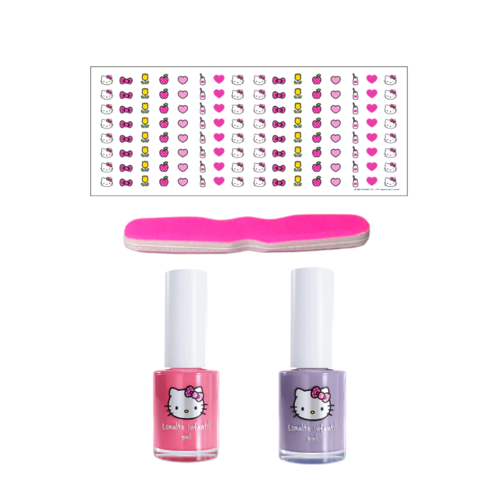 Contém: 2 Esmaltes infantis Hello Kitty by digibela (6,5ml cada) + lixa de unhas + cartela de adesivos de unhas Hello Kitty by digibela