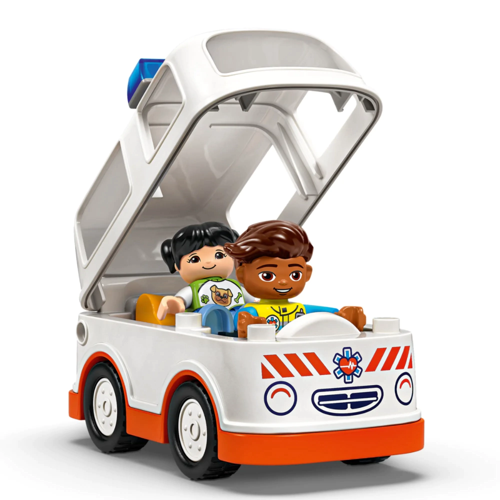 Crianças atenciosas brincam de faz de conta cenas de resgate emocionantes com o brinquedo Ambulância e Motorista (10447) para crianças em idade pré-escolar. Este brinquedo para crianças também inclui uma ambulância dirigível e 2 figuras LEGO® DUPLO®, um paramédico e uma menina, para brincadeiras imaginárias criativas.