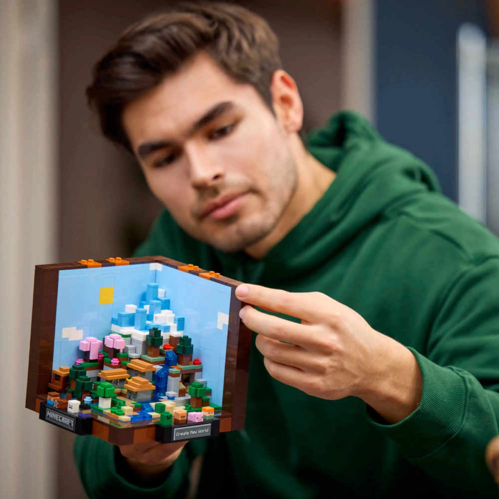 Os construtores poderão montar uma bancada repleta de ferramentas e recursos essenciais para criar e aprimorar itens. O set inclui minifiguras de um jogador e de um ajudante, além de mobs icônicos, como um gato e um zumbi, que acrescentam emoção e interatividade ao jogo.