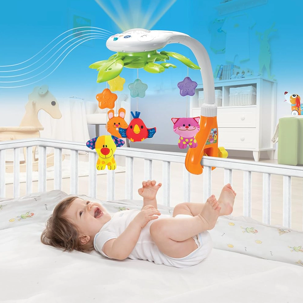Móbile Musical com 4 Amiguinhos de Estimação - Um espetáculo encantador para acalmar e entreter o bebê! Este móbile gira suavemente enquanto projeta luzes fascinantes no teto, criando um ambiente relaxante. Com músicas suaves e sons tranquilos, oferece até 15 minutos de canções de ninar que ajudam a acalmar o bebê antes de dormir. Além disso, a música, a rotação e o projetor podem ser usados separadamente, permitindo personalizar a experiência de acordo com as necessidades do momento. Um recurso perfeito para criar um ambiente de descanso e tranquilidade, promovendo uma rotina de sono mais serena.